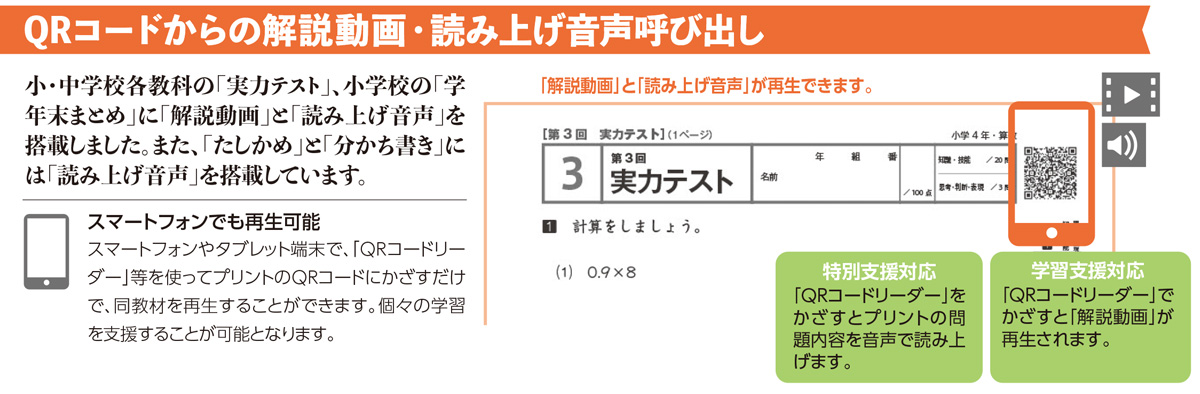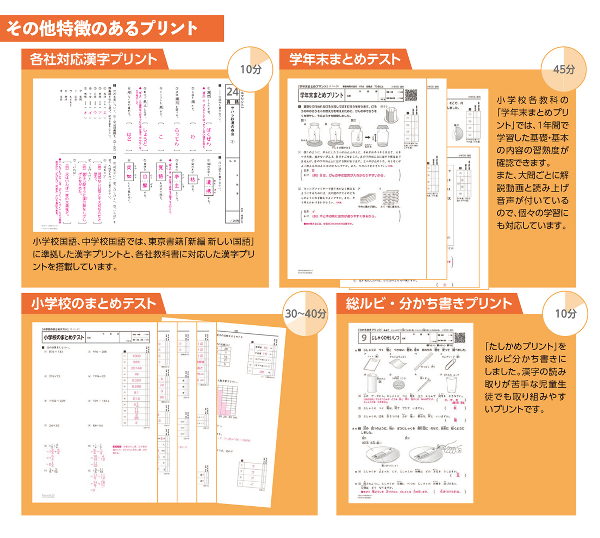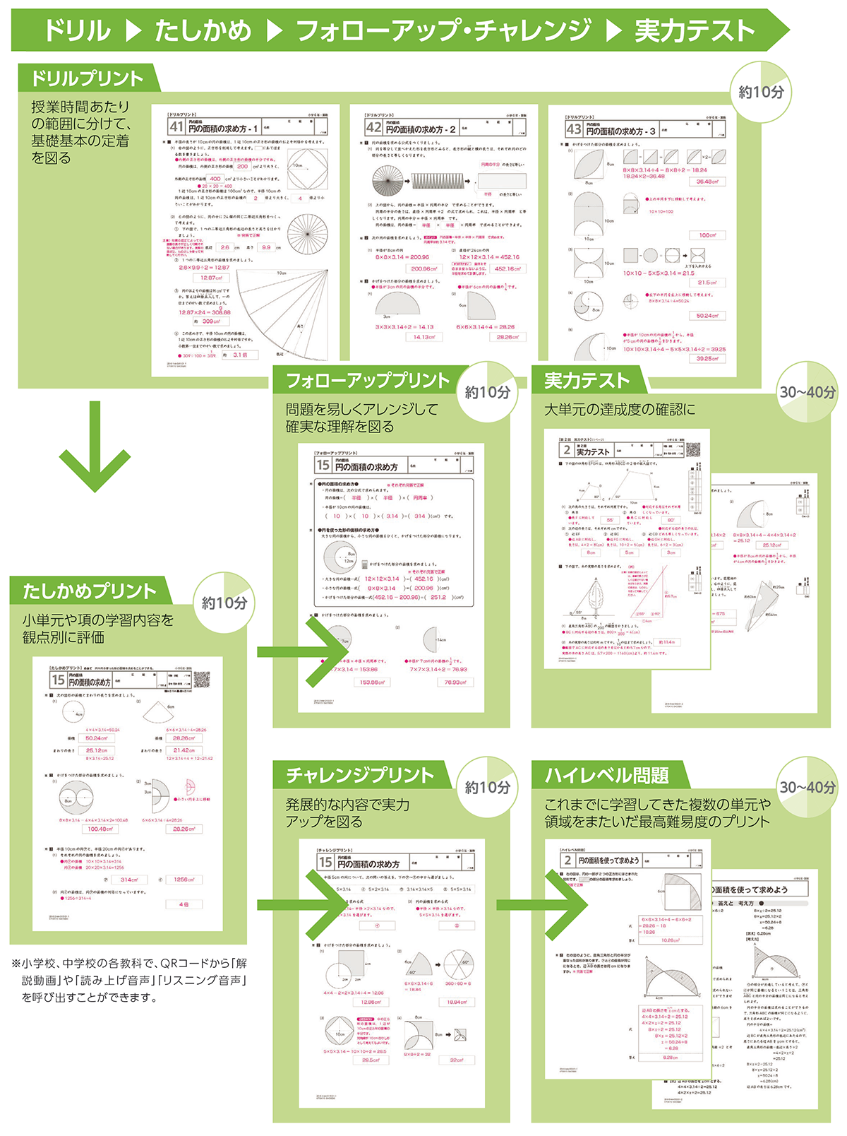 「ドリルプリント」で基礎基本の定着を図り、「たしかめプリント」で単元のまとまりごとに定着度を確認。「フォローアッププリント」「チャレンジプリント」「ハイレベル問題」で一人ひとりの習熟度に応じた個別対応を実現し、学期毎に「実力テスト」で確認。