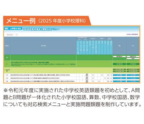 全国学力調査対応メニューでは、過去問として10年分の実施年度について、知識問題に対する対応検索メニューと、活用問題類題を搭載してきました。2019年度からは、知識問題と活用問題の別がなくなったことを受けてメニューも刷新しました。