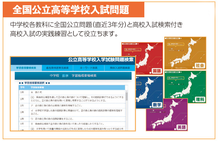 中学校各教科に全国公立問題(直近3年分)と高校入試検索付き高校入試の実践練習として役立ちます。
