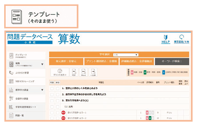 ウェブ上で問題を選択しPDF(算数・数学はWord・一太郎も可)で出力するだけの簡単操作!