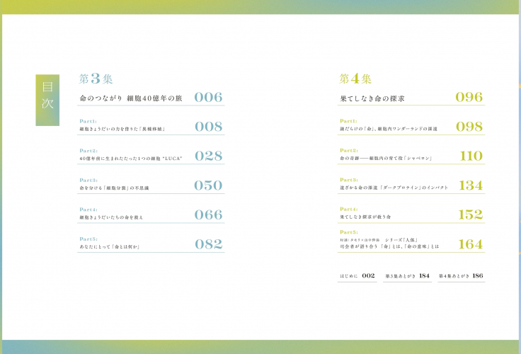 本書は、第3集と第4集(最終集)の内容をまとめたものです。シリーズ「人体」は、各回ごとに独立したテーマを扱っていて、どれか1つだけを見ても理解できるようになっています。さらに、「人体Ⅲ」では、第1集、第2集、第3集……と続けて見ることで、「命とは何か」という壮大な問いの探求がどんどん深まっていくことを、より強く感じられるように構成されています。第3集のキーワードは「細胞きょうだい」。この言葉の意味を本当に理解し、腑に落としたとき、私たちの周りに広がる世界は、確実に違って見えてきます。視聴者から寄せられた言葉を引用させてもらいます。