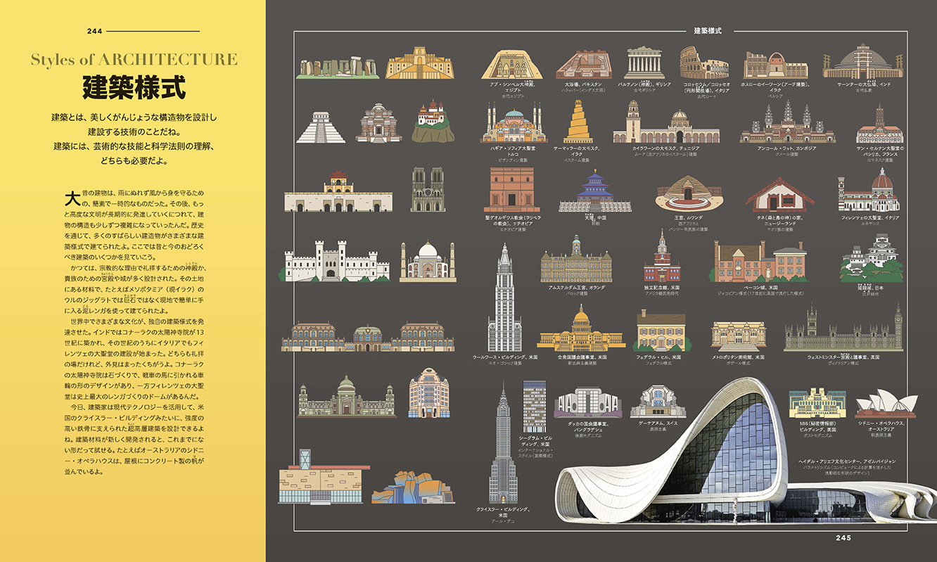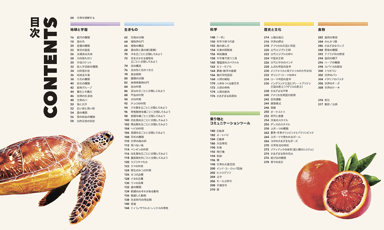 これらのすべてについてが(もちろんそれ以上ですが)、「地球と宇宙、生きもの、科学、歴史と文化、食物」のカテゴリに章立てられ、圧倒的なビジュアルの物量を使い「あつめて×ならべて×整理され」ています。