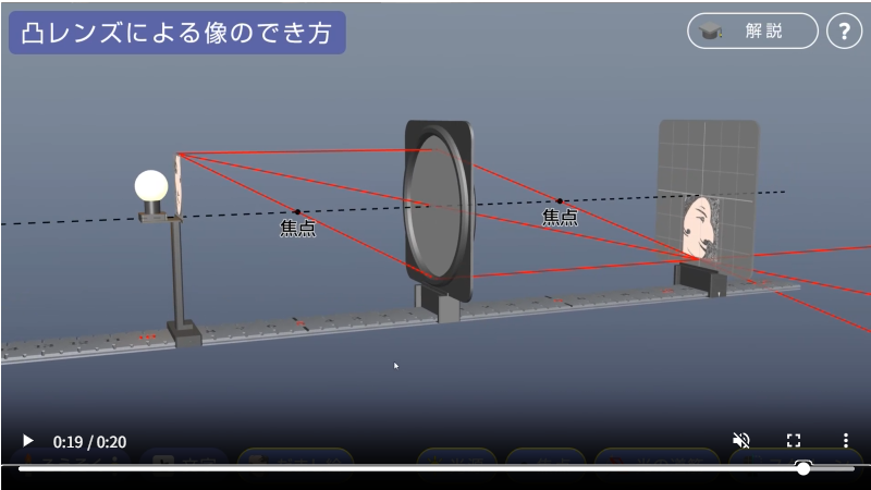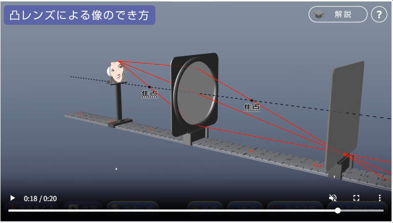 実際に直接操作することで、シミュレーションや360°回転させて見られるインタラクティブコンテンツでしょうか。通常の動画だけではわからないところまで確認できるので、生徒の学習を手助けできることが大きなメリットです。たとえば、凸レンズによる像のでき方の学習には、物体の上下左右が逆になってスクリーンに映ることを利用して作成した、だまし絵を用いた3Dシミュレーションがあります。このような生徒にも面白いと思ってもらえるコンテンツを今でも増やし続けているんです。