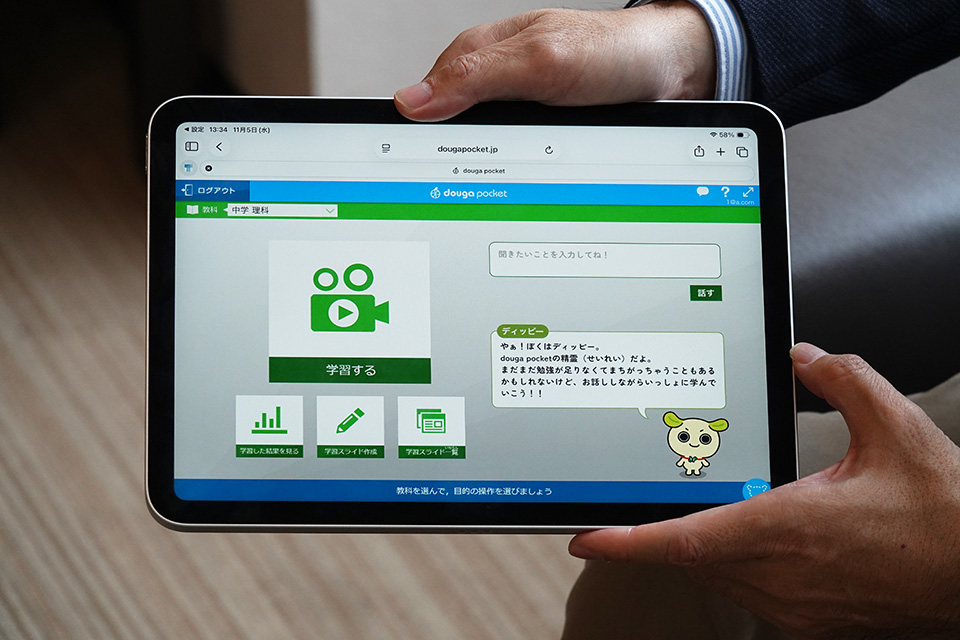 2024年度から登場した「ディッピー」のことですね。「douga pocket」の「d」と「p」でディッピー。精霊です。生徒に学習に取り組んでもらえるよう、親しみやすいキャラクターにしました。ディッピーはわからないことに答えてくれたり、生徒のモチベーションをあげるような会話をしてくれます。実は以前から、生徒の学習の継続性に対する課題の声を耳にしていました。このディッピーがその解決の一助になればと思っています。これからも時代にあわせた機能を追加して、ユーザーの声をカタチにしていきたいですね。